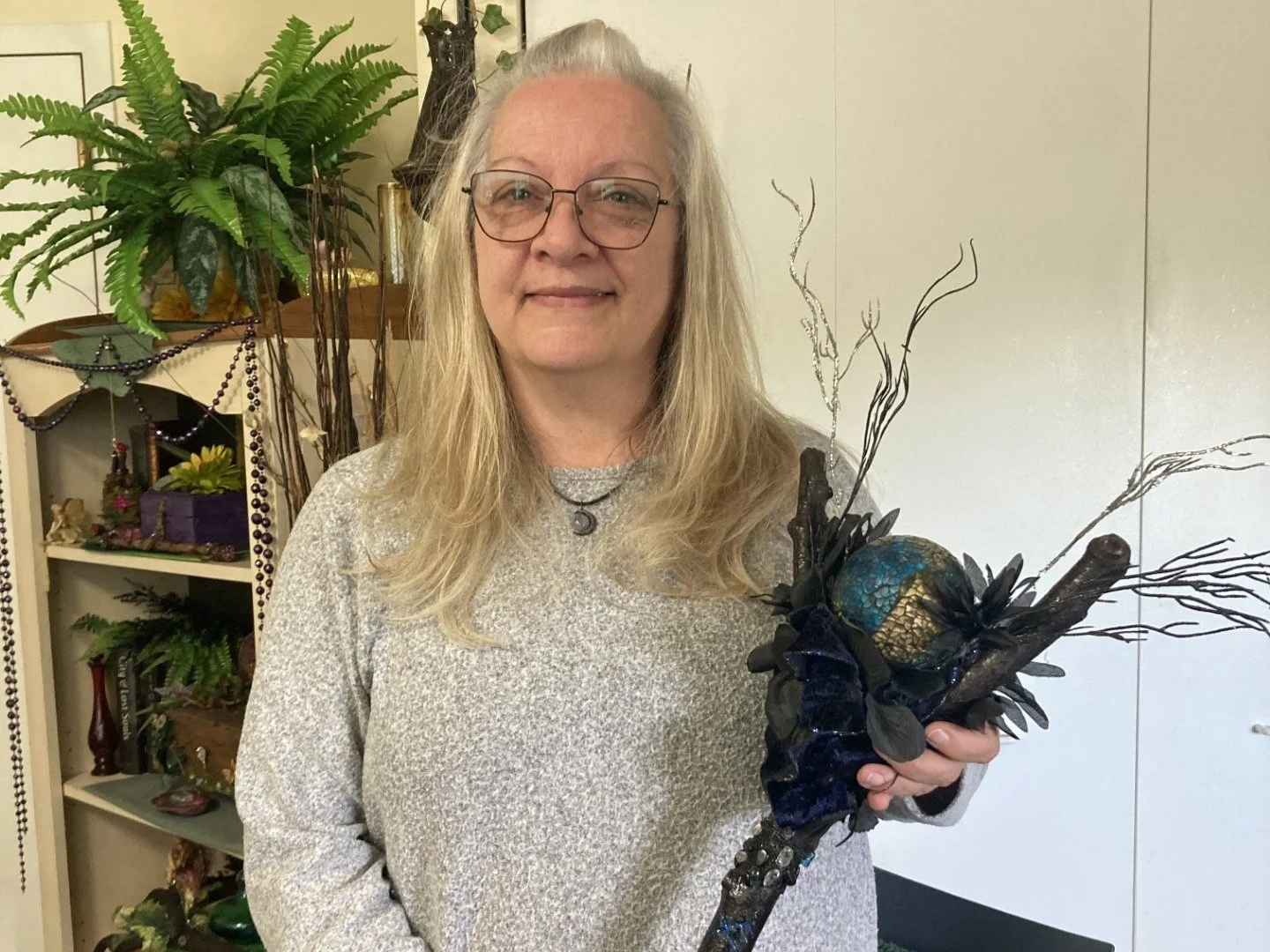When she goes walking, Sherry gathers large branches from the ground. A Lord of the Rings fan, she later carves and paints the branches and embellishes them with crystals and bits of vintage jewelry, creating wands and staffs that would make Gandalf proud.